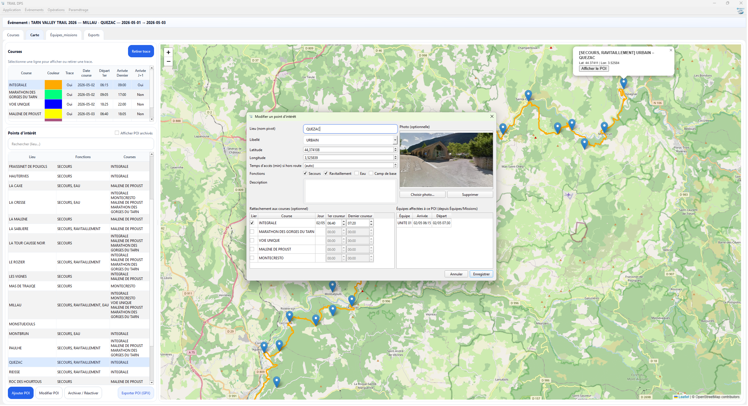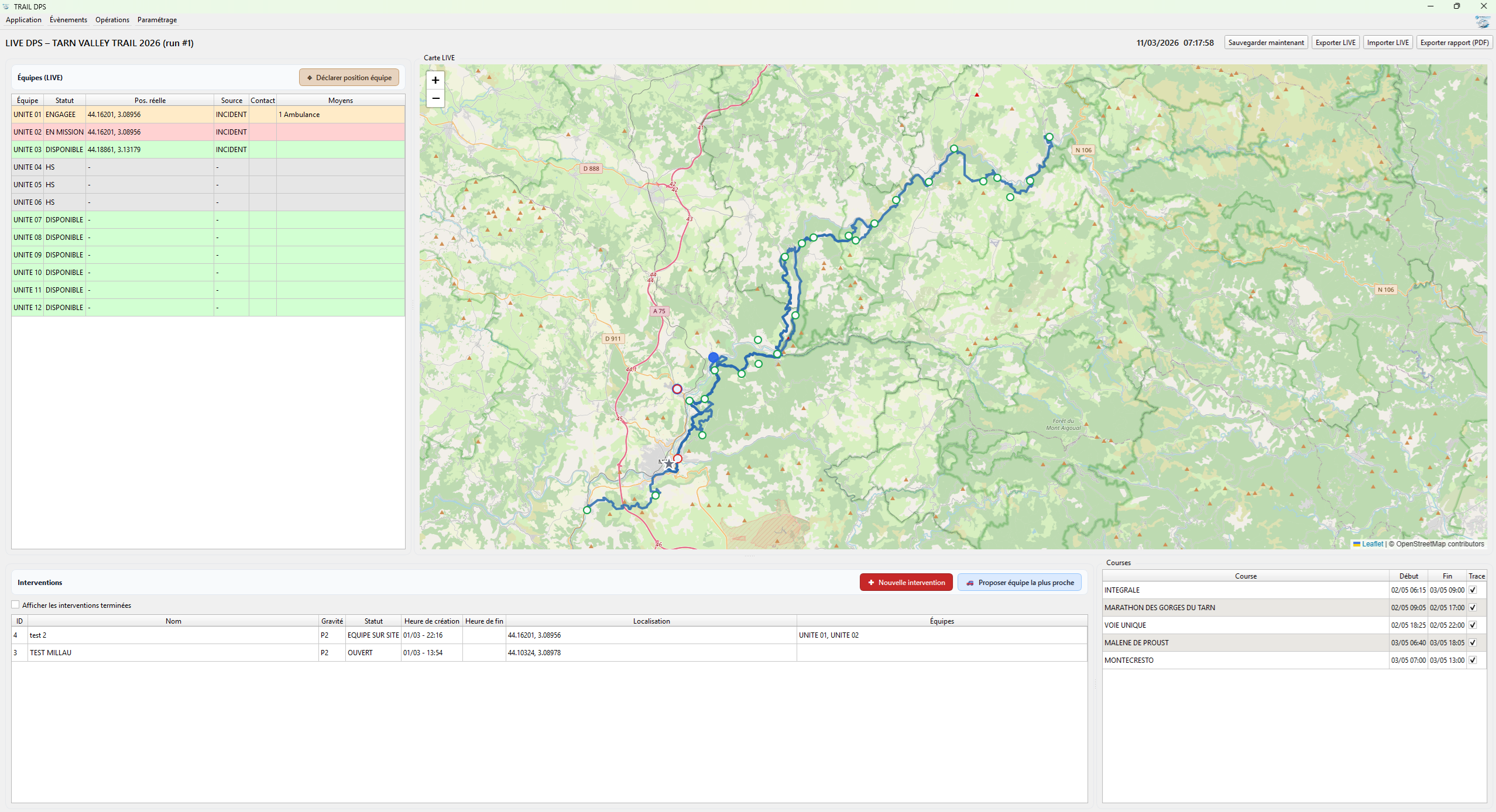 - Création de l’événement (courses, Postes de secours, points clés, moyens d'intervention)